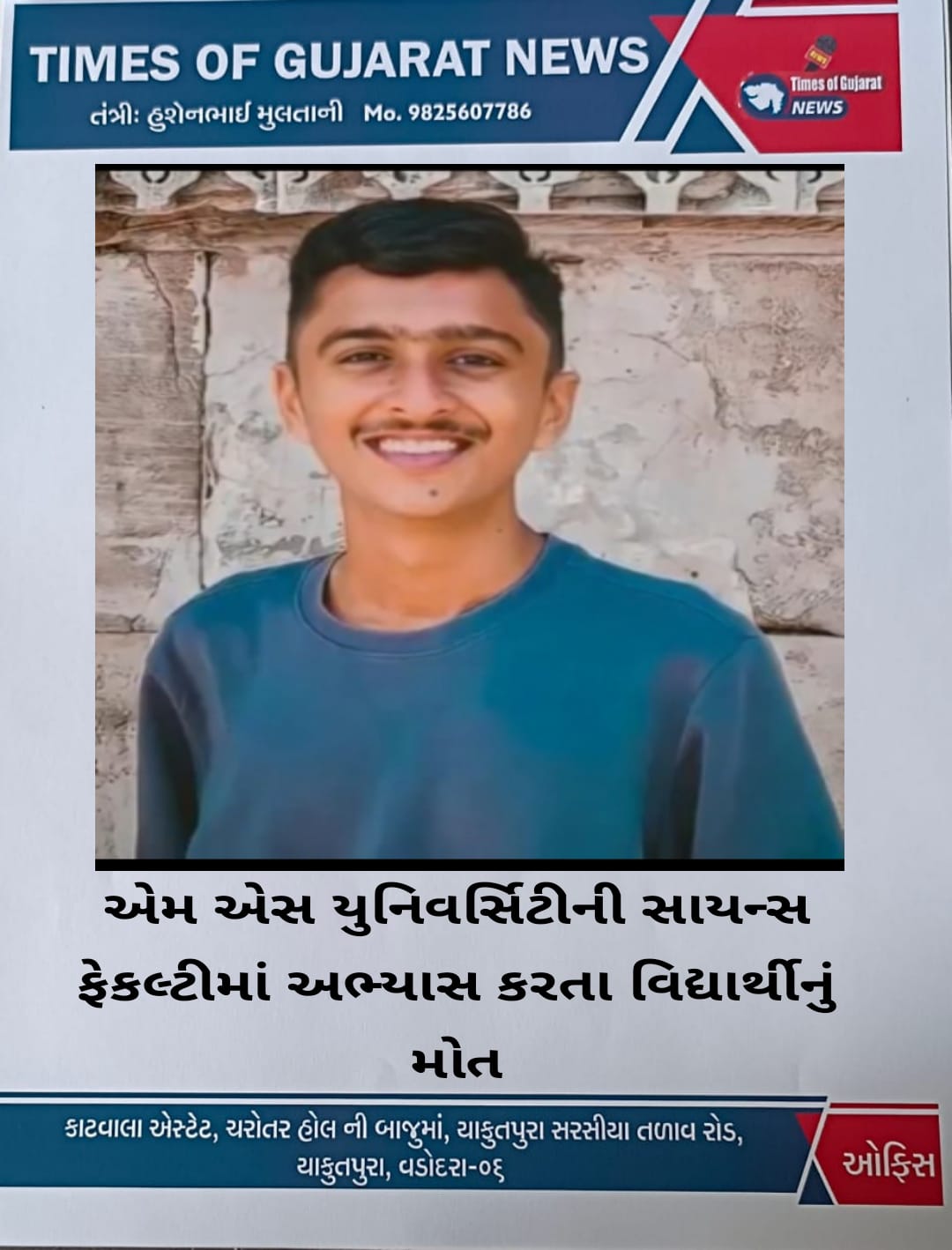 એમ એસ યુનિવર્સિટી ના સાયન્સ ફેકલ્ટી ના ઝુઓલોજી વિભાગમાં બીજા વર્ષ વર્ષમાં અભ્યાસ કરતો 18 વર્ષીય દીપ શામલાલ ચૌધરી મૂળ પાટણનો રહેવાસી પોતાના મિત્રને ગત રાત્રે 10:10 વાગે હોસ્ટેલ રૂમમાં બધા મિત્રો એકબીજા જોડે હસી મજાક ની વાતો કરતા હતા તે દરમિયાન જ દીપ ચૌધરીને છાતીમાં દુખાવો ઉપાડતા તે જમીન ઉપર ઢળી પડ્યો હતો તેની આ અવસ્થા જોઈને તેના મિત્રો ગભરાઈ ગયા હતા અને તાત્કાલિક 108 એમ્બ્યુલન્સ ને ફોન કરતા તેને સારવાર અર્થે ખસેડવામાં આવ્યો હતો પણ એમ્બ્યુલન્સ સયાજી હોસ્પિટલ લઈ જવાયો હતો જ્યાં ફરજ પરના તબીબો એ દીપને મૃત જાહેર કરતા મિત્ર વર્તુળ ઘેરાશોકમાં ગરકાવ થઈ ગયા હતા